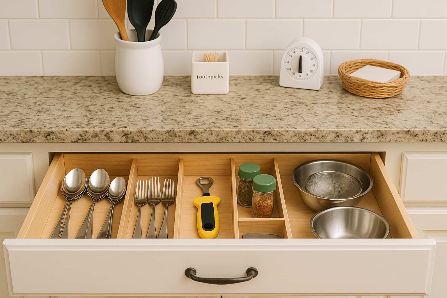 با استفاده از تقسیمکنندهی کشوها و برچسبگذاری، محل دقیق هر چیز رو مشخص کن. یه کشو برای قاشق و چنگال، یه سبد برای ادویهها، یه ظرف جدا برای دربازکن و وسایل ریزتر. وقتی همهچی سر جای خودش باشه، جمع کردن فقط چند دقیقه طول میکشه، نه یه ساعت. در این صورت حتی بقیه اهل خونه هم یاد میگیرن که هر چیزی کجاست، بدون اینکه هی ازت بپرسن.
